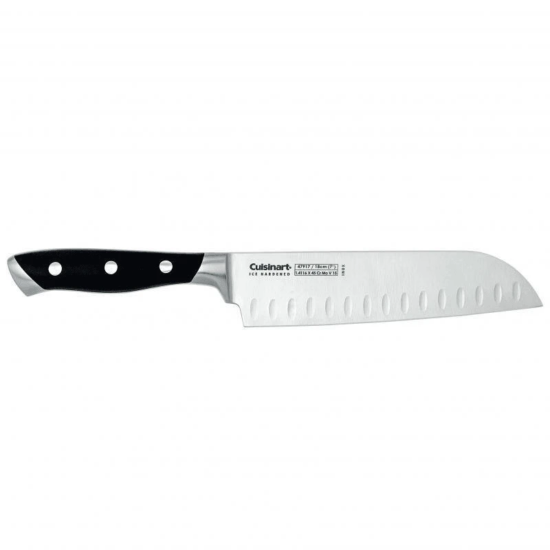 The Cuisinart Santoku Knife is just the tool for getting those Asian dishes ready efficiently and quickly. The scalloped, full-tang blade is made of high quality ice hardened German stainless steel for maximum durability. At 18 cm long, the knifes razor-sharp edge is hand ground at 20 degrees. Get only the best with Cuisinart!