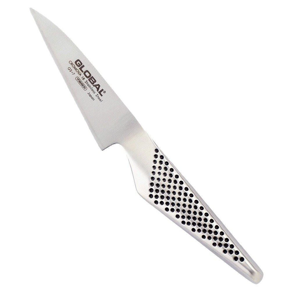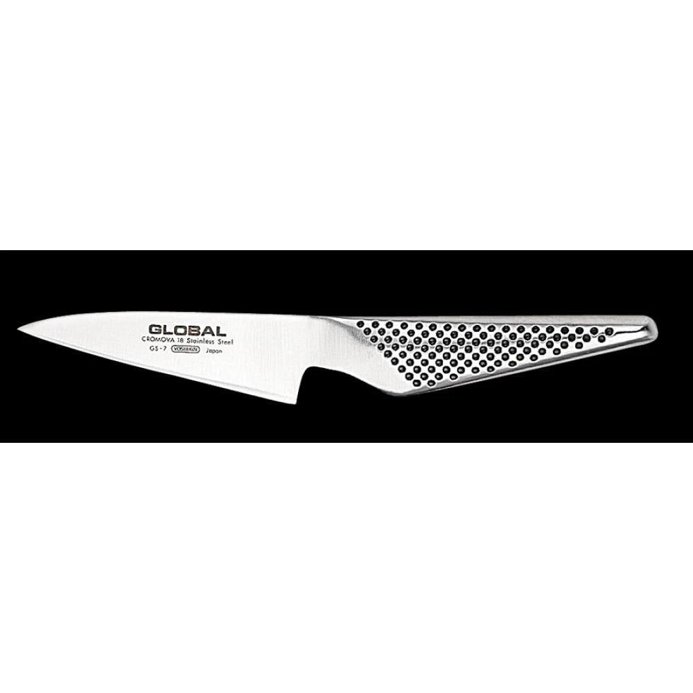 Santoku-style paring knife that is great for slicing, dicing, peeling, and precision cutting. GLOBAL knives are made in Japan from the finest stainless steel material. The blades utilize CROMOVA 18 stainless steel, Ice tempered and hardened to Rockwell C56- 58 which holds a razor-sharp edge longer than any other steel and resists rust, stains, and corrosion Other unique features of Global knives are their smooth contours and seamless, all stainless steel construction which eliminates food and dirt traps offering the ultimate in safety and hygiene.