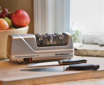 Coddle your cutlery with, the ChefChoice professional sharpening station 130. It offers the serious cook, professional chef, or knife connoisseur edge versatility with a 3-stage sharpening system that features our renowned sharpening and stropping stages as well as the world most advanced steeling process. Built-in precision angle guides in all three stages eliminate guesswork and produce consistently sharp edges every time. The ChefChoice professional sharpening station 130 eliminates the clutter of ineffective sharpening gadgets and provides in one compact appliance, The ultimate versatility of choosing the preferred edge for any cutting task. With the ChefChoice sharpening station you can do it all, Simply with the push of a single on/off button. And the astonishingly sharp, long-lasting edge is better than factory sharp, no matter which type of edge you choose. No experience necessary or skill required!