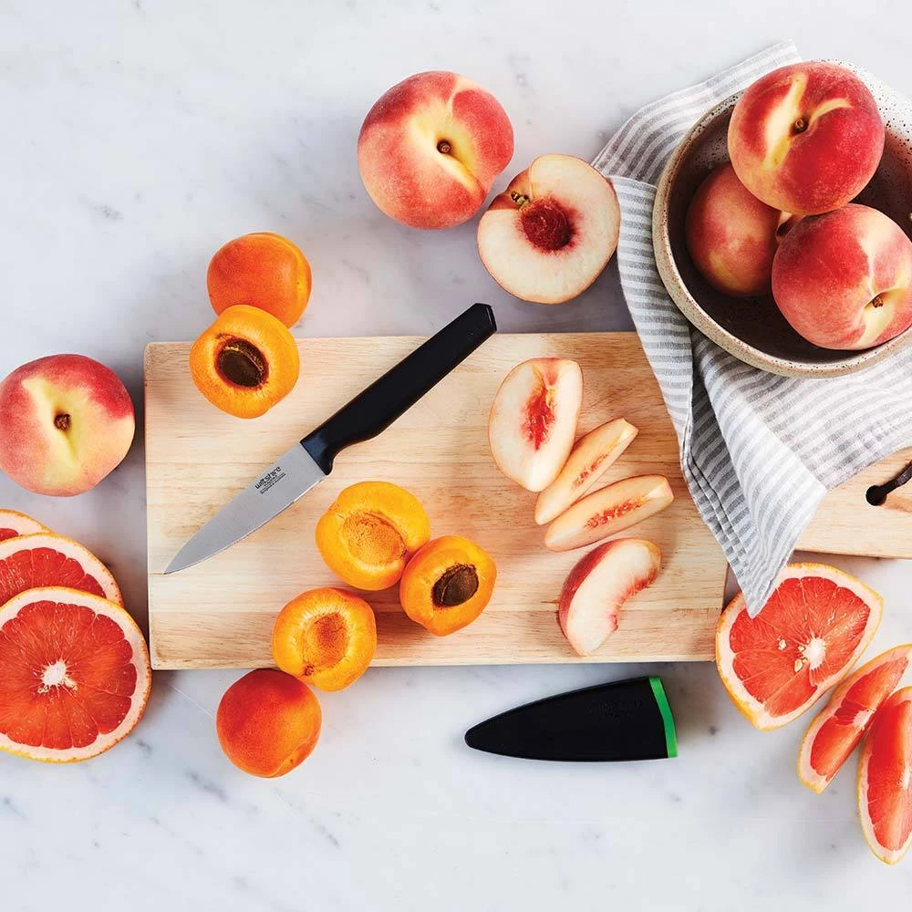 Perfect for making quick work of cutting fruit and small vegetables, this knife makes light work of food preparation with its Staysharp blade. Thanks to the patented self-sharpening system you can ensure no more blunt knives. Why you’ll love me… Every good cook knows that a sharp knife makes light, safe work of food preparation. Thanks to the patented self-sharpening system of Staysharp you can ensure no more blunt knives. Simply insert and withdraw the knife from the scabbard for a sharp knife every time. The Staysharp Paring knife’s fine sharp edge is designed to take the frustration away so that you can cut that apple or tomato with ease. Small and handy, it your go-to knife that as comfortable in your kitchen as it is outdoors. Like all Wiltshire knives, it made from superior quality stainless steel so it rust-resistant making it perfect for those who cherish the quick and easy and those with a strong desire to create roses from tomato peels.