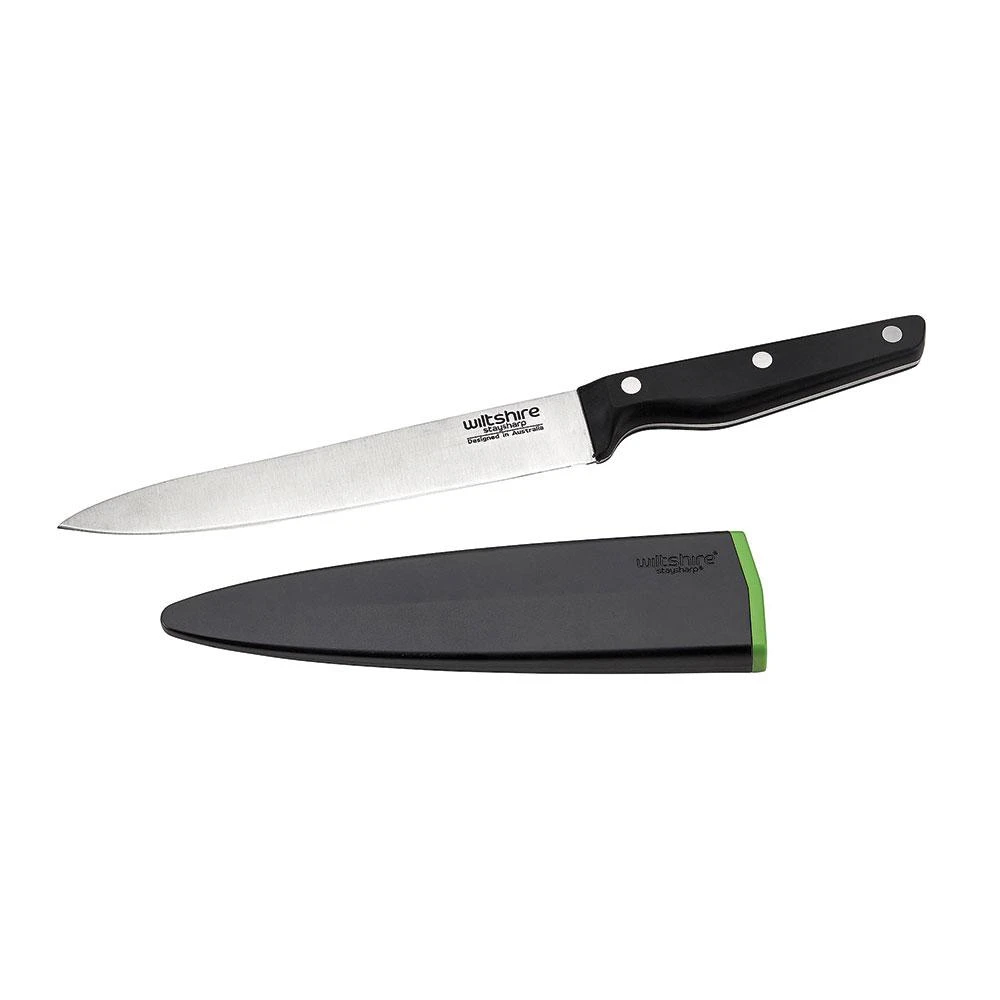 Ideal for carving and slicing cooked meats, boneless roasts and poultry. This knife makes light work of food preparation with its Staysharp blade. Thanks to the patented self-sharpening system you can ensure no more blunt knives. Why you’ll love me… Best for carving up the Sunday roast, the Staysharp Carving Knife has been created to do one thing brilliantly: a fine sharp edge to make quick work of the prime cut. Thanks to the clever self-sharpening system of Staysharp you can ensure no more blunt knives. Simply insert and withdraw the knife from the scabbard for a sharp knife every time. Ideal for carving and slicing cooked meats, boneless roasts and poultry. Like all Wiltshire knives, it made from superior quality stainless steel so it rust-resistant. So armed with your favourite carving knife and versed in the ways of the grain, carve away knowing that you have the edge. Bless that well-honed blade!